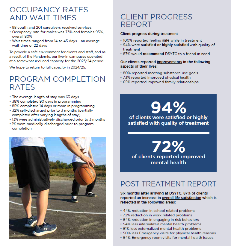 However, we at the DSYTC are committed to evidence-based practices and as part of our evaluation framework, we collect and analyze qualitative and quantitative data which helps illustrate the tremendous progress our clients achieve (both during live-in treatment and within their post live-in treatment environment).